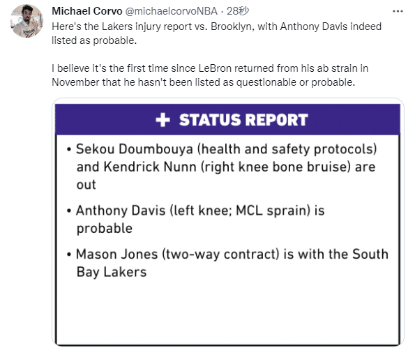 湖人官方已经正式宣布下一场对阵篮网的伤病报告,詹姆斯复出后首次不在伤病名单上,这说明老詹的腹部伤势已经100%痊愈,浓眉大概率复出。