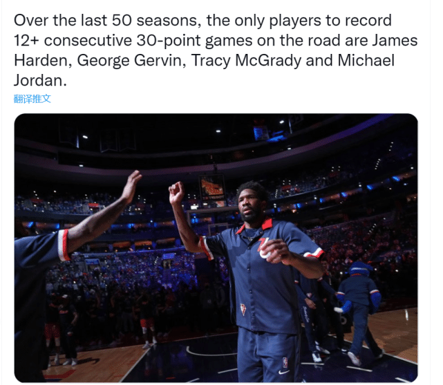 据ESPN统计,恩比德今天还创造了一项里程碑,这是他连续第12个客场砍下30+,成为NBA近50年第5位做到这一点的球员,比肩乔丹、乔治格文、麦迪以及哈登。