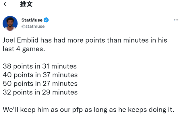另外,恩比德最近4场的数据分别是31分钟38分、37分钟40分、27分钟50分以及29分钟32分,连续4场得分超过出场时间,效率实在太高了。