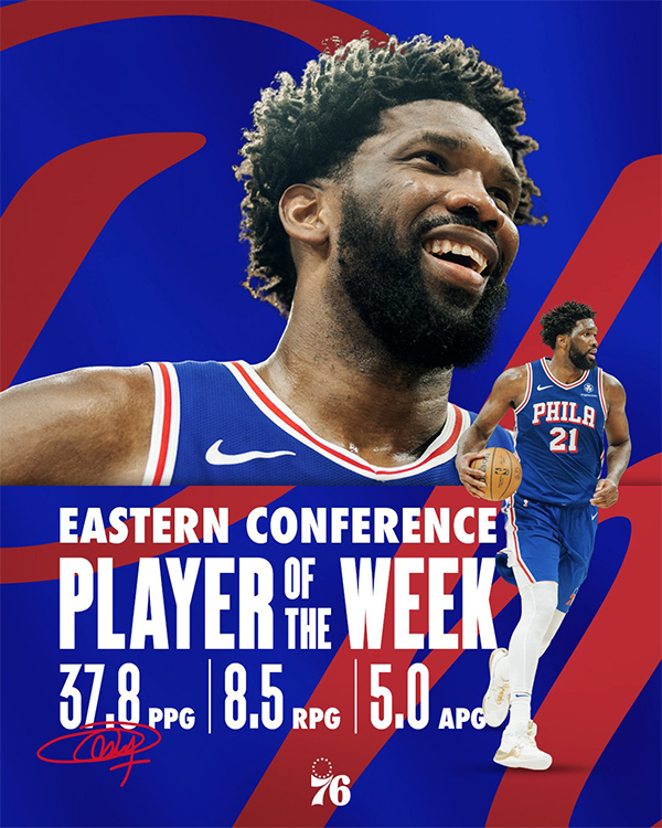 恩比德上周出战4场比赛,场均得到37.8分8.5篮板5助攻,带领76人拿到4胜0负的战绩——对阵火箭拿到41分10篮板3助攻,对阵掘金拿到41分7篮板10助攻,对阵魔术拿到36分7篮板2助攻和对阵黄蜂拿到33分10篮板5助攻。