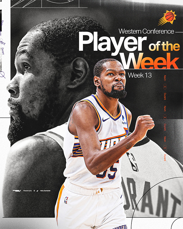 杜兰特本赛季首次获得西部周最佳,太阳生涯首次获此殊荣,这也是杜兰特生涯第32次获得周最佳,为NBA历史第三多;仅次于詹姆斯(67次)和科比(33次),太阳官方祝贺杜兰特。