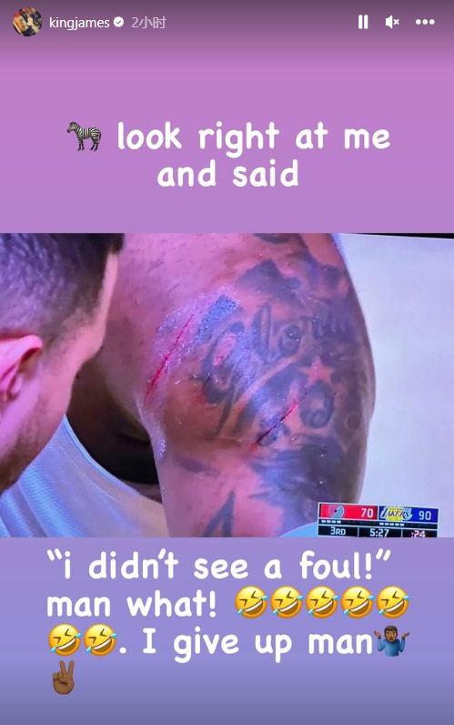 在湖人击败开拓者的比赛中,詹姆斯在一次进攻中被亨德森划伤手臂,三道血口子十分清晰,即使遭遇如此防守,裁判仍旧没有吹罚犯规;今日詹姆斯晒伤口抱怨裁判,配文写道:裁判看着我,说‘我没看到犯规’,这是什么判罚,我真的服了(摊手表情)。