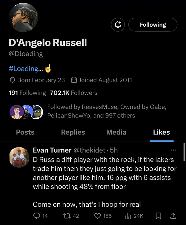 拉塞尔通过社媒点赞前NBA球员埃文-特纳的推文,特纳写道:拉塞尔是一名与众不同的球员,如果湖人想要交易他,那就得找一个像他一样,场均16分6助攻,投篮命中率48%的球员回来。