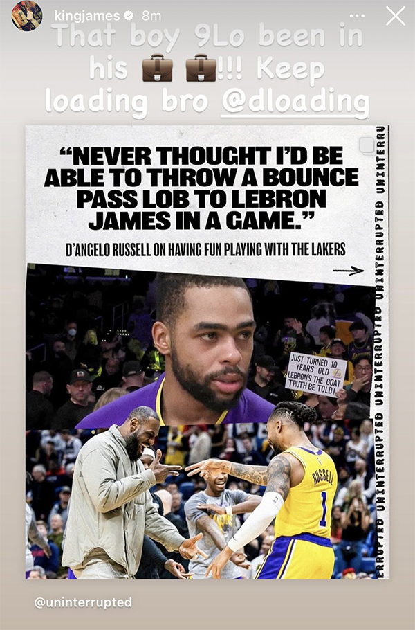 詹姆斯转发拉塞尔言论(从未想过我能在比赛中给詹姆斯送出击地传球)并且写道:那个男孩一直在展示他的技能包,兄弟,继续加载@拉塞尔;湖人击败开拓者赛后,詹眉以及哈姆都发声称赞拉塞尔。