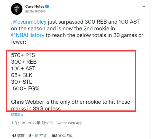 据骑士媒体统计,莫布里本赛季总篮板已经突破300个,总助攻突破了100个,他就此成为NBA历史上第二位在生涯前39场比赛内送出至少570分300篮板100助攻65盖帽30抢断且投篮命中率超过50%的新秀,比肩93-94赛季的克里斯韦伯。