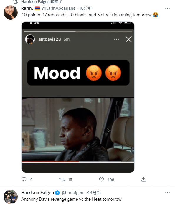 湖人记者Harrison Faigen发推写道,安东尼-戴维斯将在明天对阵热火完成复仇;该记者还转发一位包装工球迷的动态,该球迷写道:浓眉明天复出首战轰下40分17篮板10盖帽5抢断。