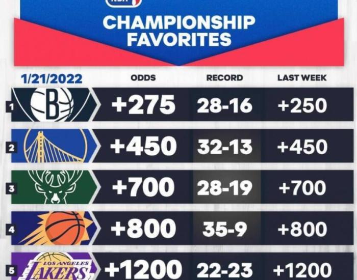 来源:JRS直播网01-22 16:28JRS直播网01月22日讯 北京时间1月22日,NBA官方公布了最新的夺冠赔率,结果令人非常意外。篮网高居第一,勇士、雄鹿和太阳分列2-4位。湖人竟然排名第5,赔率是+1200!