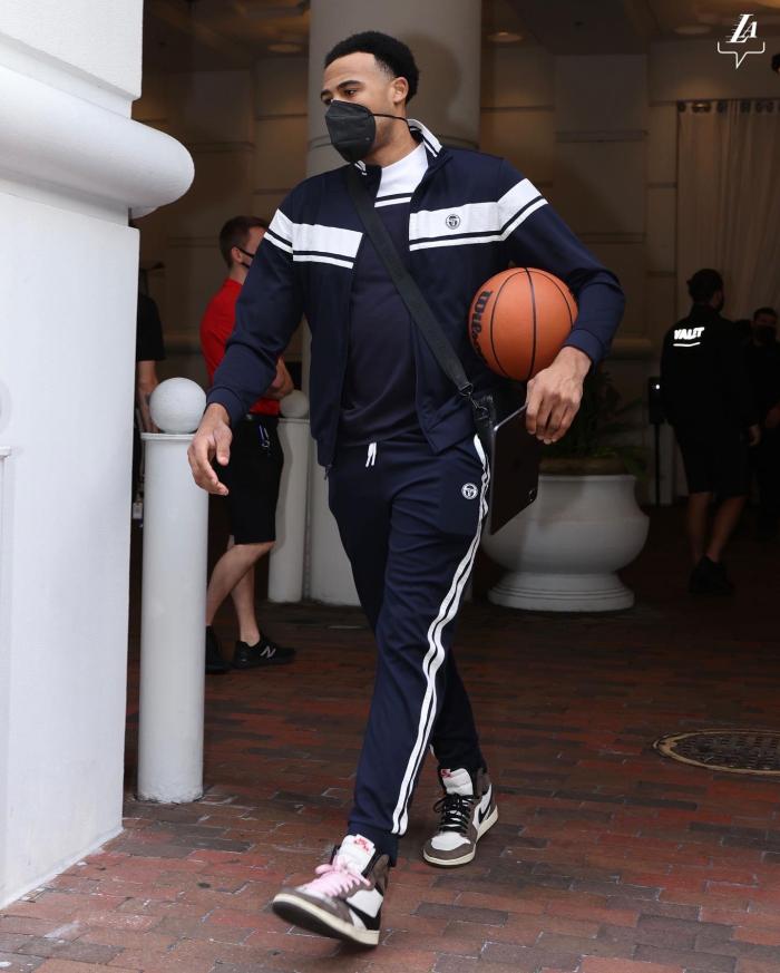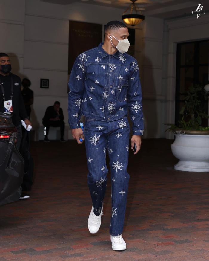 湖人官方晒出威少、塔克和斯坦利-约翰逊的入场照,威少身穿一套印有雪花图案的牛仔套装,表情十分严肃、塔克抱着篮球、约翰逊拿着盒饭。