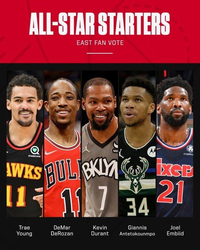 1、杜兰特 5496513票,2、字母哥 5124925票,3、恩比德 3305229票,4、塔图姆 1580022票,5、巴特勒 1384267票,6、贾雷特-阿伦 507074票,7、西亚卡姆424135票,8、阿德巴约 417661票,9、迈尔斯-布里奇斯 330372票,10、阿尔德里奇 318655票