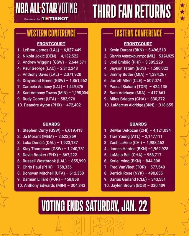 全明星第三轮投票结果!詹姆斯反超库里成新票王:7天猛增244万票