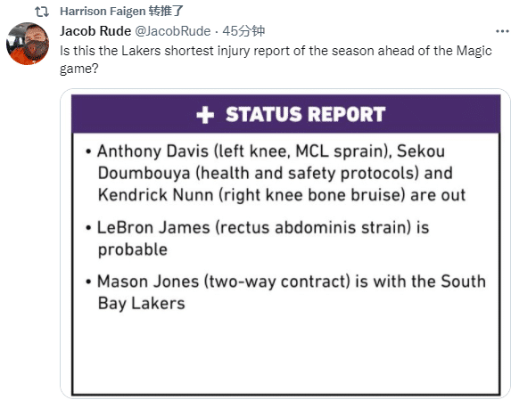 不久前,湖人官方公布下一场对阵魔术的伤病报告,詹姆斯仍旧在伤病名单上,大概率出战魔术;不过安东尼(背部痉挛)和霍华德(膝盖酸痛)都已痊愈,可以出战下一场比赛;浓眉、纳恩和敦布亚(触发防疫协议)都缺战,梅森-琼斯仍在发展联盟。