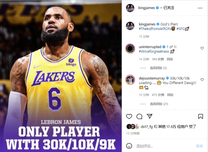 到目前为止,詹姆斯职业生涯总共拿到36319分10002篮板和9908助攻,助攻距离破万仅差92次;马刺球员穆雷在评论区留言:冲击3万+1万+1万,你是与众不同的老大哥。
