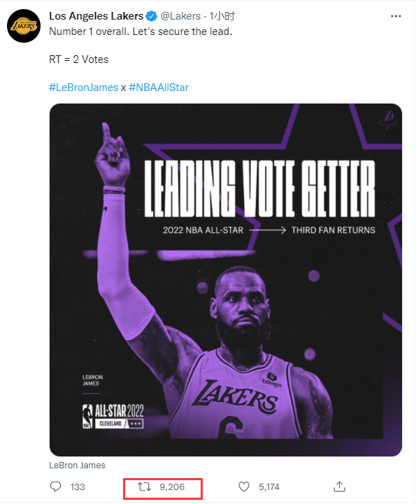 今天是最后一个双倍计票日,湖人官方再次为老詹拉票,发推写道:总数联盟第一,让我们继续保持领先;1次转推等于2票。