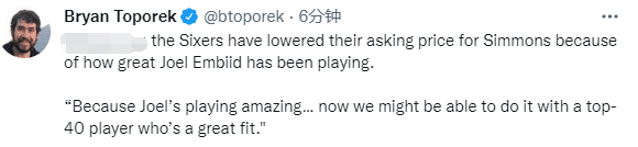 来源:JRS直播网01-21 10:32JRS直播网01月21日讯 ,费城76人已经开始降价交易西蒙斯,据美媒B/R记者Bryan Toprek报道,由于恩比德的出色表现,76人已经降低了对西蒙斯的要价,索要排在联盟前40名的球星。