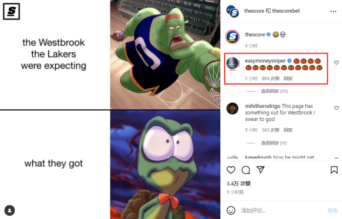 美媒the Score晒图表示:湖人期待的威少和实际得到的威少;对此杜兰特十分不满并且力挺威少,回复了15个番茄表情,言外之意就是“你们(媒体)太烂了”。