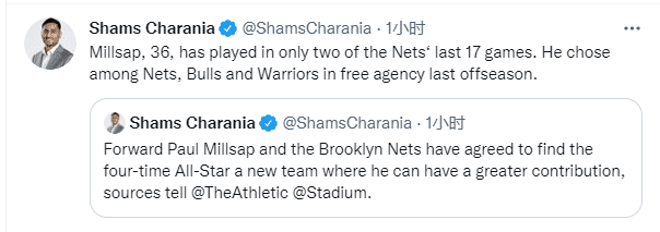 据名记shams报道,篮网已经和米尔萨普达成分道扬镳的协议,篮网将会为他寻找新的东家;过去17场比赛,米尔萨普仅仅只打了2场比赛,本赛季只为篮网打了24场比赛,场均上场11.3分钟贡献3.4分3.7个篮板,投篮命中率37.6%,三分命中率只有22%,因个人原因缺席多场比赛。