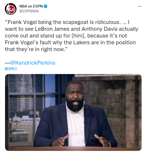 对于沃格尔险些被解雇,名嘴帕金斯表示:弗兰克-沃格尔成为球队的替罪羊是荒谬的,我想看到勒布朗-詹姆斯和安东尼-戴维斯站出来支持他,因为湖人现在处在这样的位置并不是沃格尔的错。