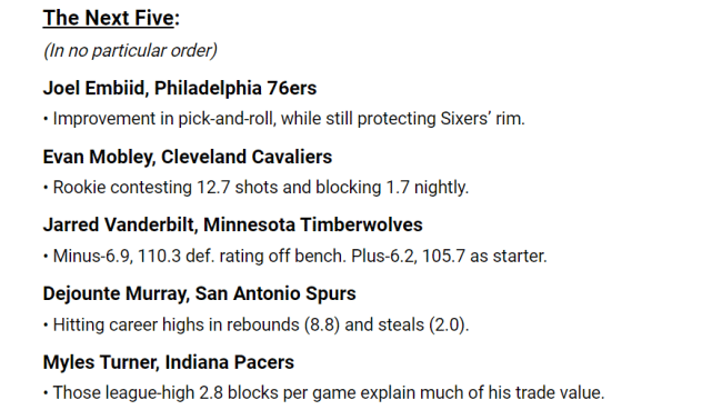 字母哥不但在MVP榜的排名上升,他在最佳防守球员榜上也升至榜首位置。场均干扰10.1次投篮,他防守下对方命中率下降3.9%,字母哥的防守表现稳定。布鲁克-洛佩斯长期伤停后,他承担了更重要的防守任务,在多项防守领域产生影响。2019-20赛季,字母哥曾同时捧起MVP和最佳防守球员奖,本赛季,随着杜兰特的伤停和库里的低迷,他又有机会做到这一点。