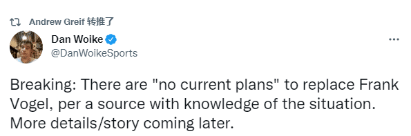 来源:JRS直播网01-19 10:20JRS直播网01月19日讯 ,此前有记者报道湖人险些解雇沃格尔,他随时都有可能下课;如今剧情反转,湖人记者Dan Woike报道,了解相关情况的消息人士透露,湖人目前没有解雇沃格尔的计划。