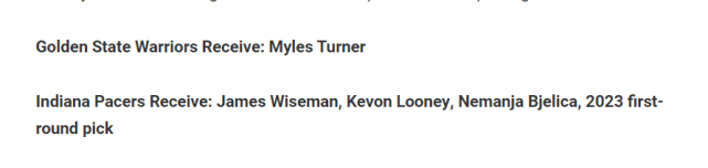 此前有报道称,步行者交易特纳的要价已经曝光,他们希望得到两个首轮签或者一个首轮签+一个有前途的年轻球员。对特纳感兴趣的除了湖人,还有独行侠、开拓者、森林狼、尼克斯和黄蜂。勇士完全可以加入其中,他们的报价也很有竞争力,Fadeaway World列出了一笔4换1的方案,具体是勇士送出卢尼、怀斯曼、别利察和一个2023年的首轮签,从步行者换回特纳。