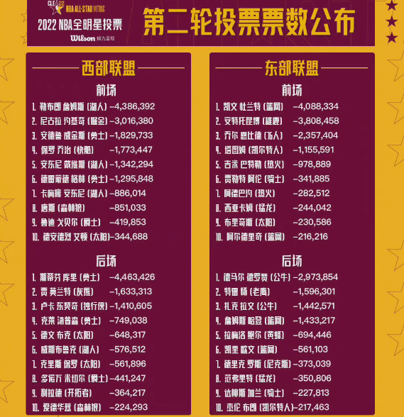 上一期的全明星票选结果出炉之后,詹姆斯已经升到第二名,榜首的是库里,不过两人之间的差距很小,不到8万票,这对于疯狂的球迷们,尤其是还有“双倍计票日”的加持,差距可以说是微乎其微。