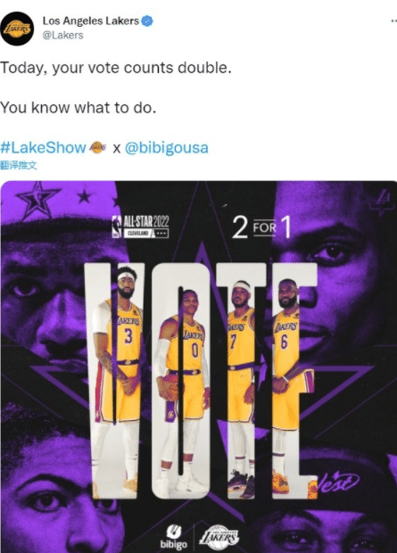 来源:JRS直播网01-18 16:15JRS直播网01月18日讯 ,NBA全明星再度进入到“双倍计票日”,也就是1票等于2票。目前胜率已经跌破50%,位居西部第八的湖人在社交媒体上开始为四大巨星拉票,他们分别是詹姆斯、威少、安东尼和浓眉哥。湖人官方配文:“今天是双倍投票日,你们知道该做什么吧。”