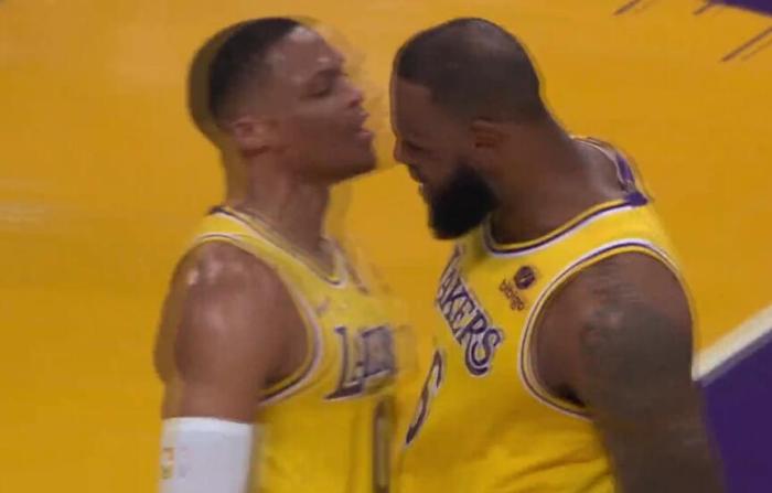 威少炸裂隔扣DPOY!怒吼点燃全场,詹皇上前撞胸祝贺,差点脱手了
