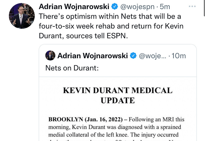 来源:JRS直播网01-17 11:46JRS直播网01月17日讯 ,篮网官宣布了杜兰特的伤情,膝盖MRI检测结果,显示杜兰特遭遇了左膝内侧副韧带扭伤,将会缺席一段时间。很快名记就透露,称内部乐观认为,杜兰特将在4-6周的康复治疗后复出。也就是说,杜兰特的伤病恢复,至少需要4-6周的时间,这期间他将无缘比赛。