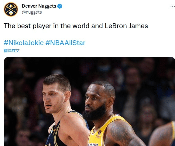 有人欢喜有人愁,大胜的掘金是非常开心的,赛后,掘金官推晒出约基奇和詹姆斯的同框图,为约基奇全明星拉票,并写道:“世界最佳球员和勒布朗-詹姆斯 #尼科拉-约基奇#NBA全明星”