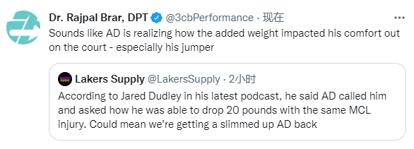 对于浓眉减重这件事,医学专家Rajpal Brar发推写道:看来浓眉已经意识到体重对他在场上表现的影响,尤其是跳投;本赛季,浓眉的体型曾遭质疑,球迷经常调侃可能是休赛期天天在家打游戏导致的。