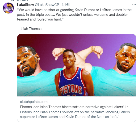 近日,活塞名宿“微笑刺客”托马斯谈到詹姆斯和杜兰特在他们那个年代打球仍不可阻挡,直言除非他们双人包夹并且严重犯规,否则根本就没人能防住他俩。