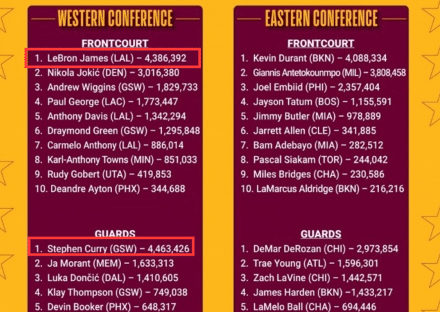 NBA今日公布了全明星次轮投票结果,虽然萌神仍然排在西部第一,但短短一周时间被詹姆斯狂追近50万票,如今领先优势已经不到8万票了,看上去第一的位置非常危险。这让很多球迷想起了去年,当时詹姆斯也是首轮投票落后库里,最终反超萌神当选票王。按照目前的势头来看,詹姆斯确实很有可能再次后来居上成为西部队长。