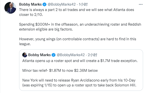 据薪资专家bobby marks报道,达成这笔交易后,老鹰将腾出一个阵容位置,并将创造出170万美元交易特例,低于奢侈税线的距离也从187万美元变为236万美元。尼克斯则需要提前裁掉后卫瑞安-阿尔奇迪亚科诺的10天合同,以腾出阵容空间收下希尔。