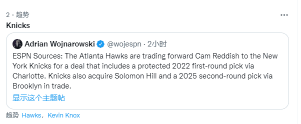 来源:JRS直播网01-14 14:42JRS直播网01月14日讯 NBA又有一笔大交易达成,老鹰和尼克斯达成一笔3换2大交易,如此交易引热议,冲上推特热搜榜第二名。