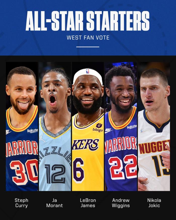 按照目前的球迷票选结果,东部全明星首发五虎是杜兰特、字母哥、恩比德、特雷-杨和德罗赞;西部全明赛首发是詹姆斯、库里、莫兰特、维金斯和约基奇。