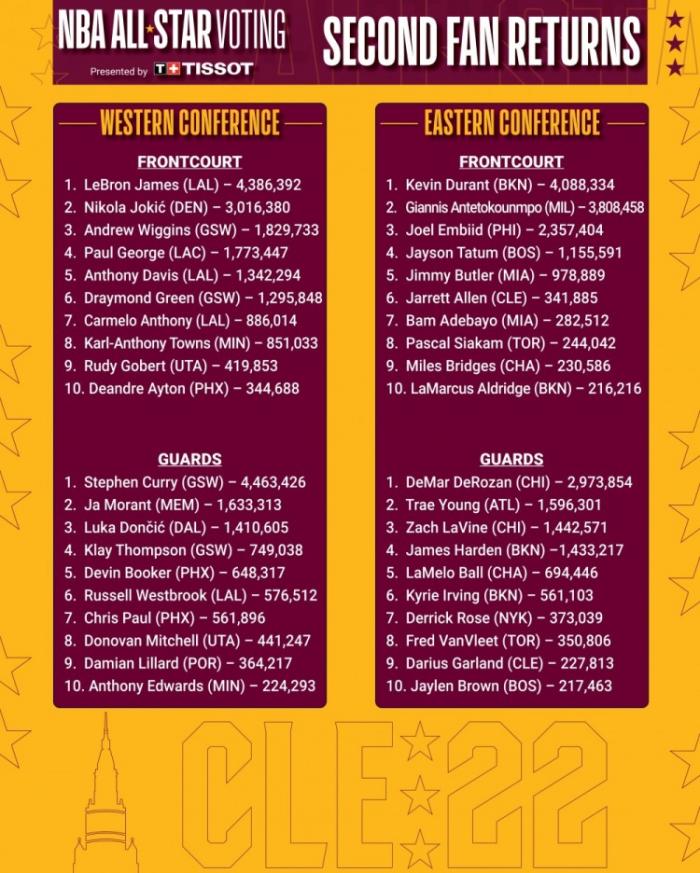 来源:JRS直播网01-14 14:41JRS直播网01月14日讯 ,NBA官方正式公布2022年全明星第二轮投票结果出炉,库里4463426票力压詹姆斯4386392票和杜兰特4088334票继续领跑全联盟,杜兰特继续领跑东部;全联盟仅仅只有库里、詹姆斯和杜兰特三大超巨的票数超过400万。