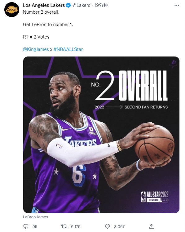 湖人官方继续为詹姆斯拉票,发推写道:全联盟排名第二,让勒布朗成为第一,1次转推相当于两票。