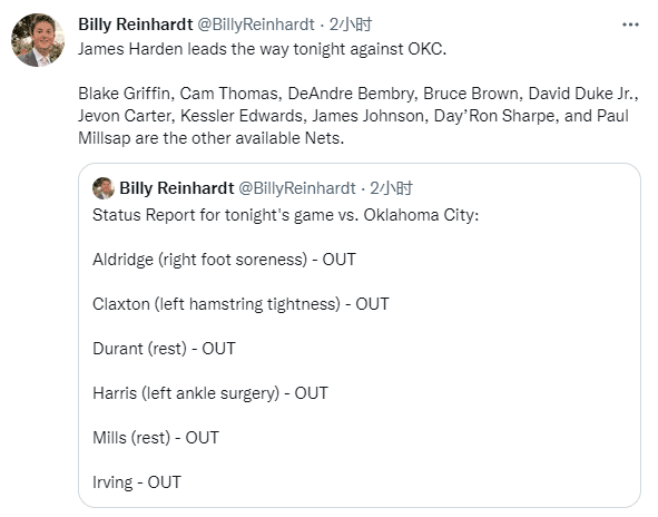 杜兰特轮休,欧文没资格参加主场比赛,篮网全队6人缺战雷霆;哈登单核带队出战,能上场的还有格里芬、托马斯、本布里、布朗、杜克、杰文-卡特、爱德华兹、约翰逊、米尔萨普和夏普。