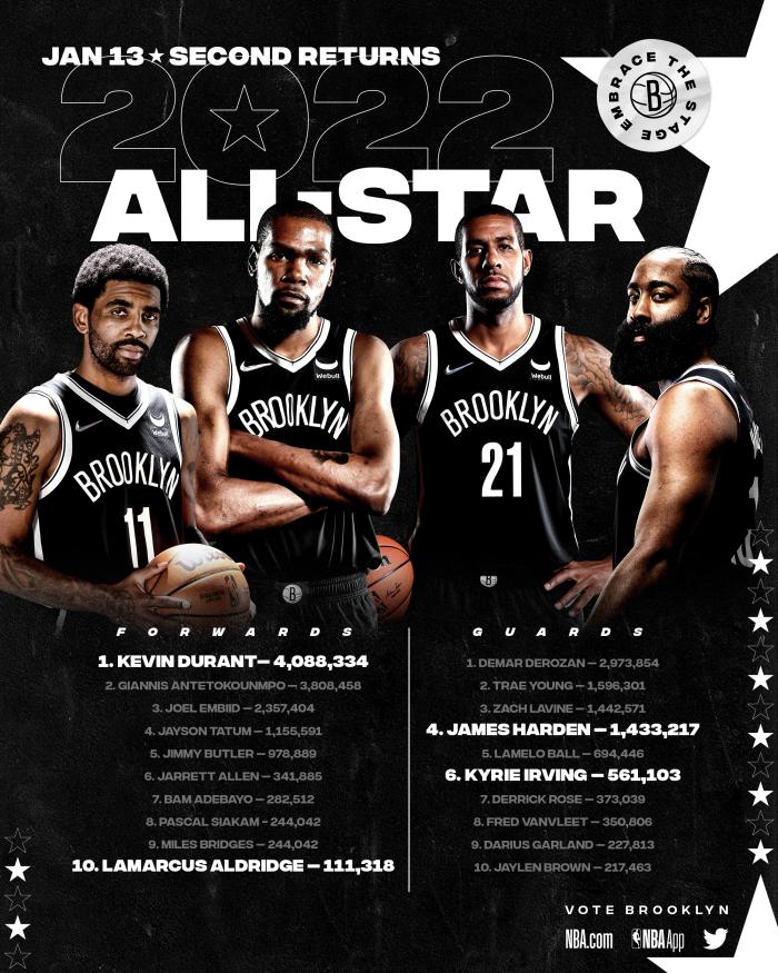 全明星第二轮投票结果出炉,杜兰特4088334票继续领跑东部,总票数排在联盟第三,有望再次当选全明星分区队长;另外哈登获得1433217票,欧文获得561103票和阿德111318票。