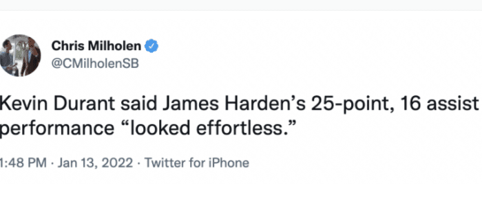 比赛结束之后,杜兰特盛赞哈登,称他今天砍下25分16助攻的表现,看起来毫不费力。