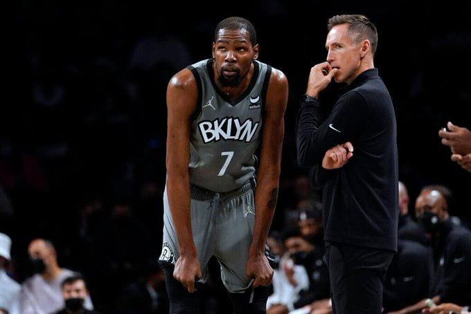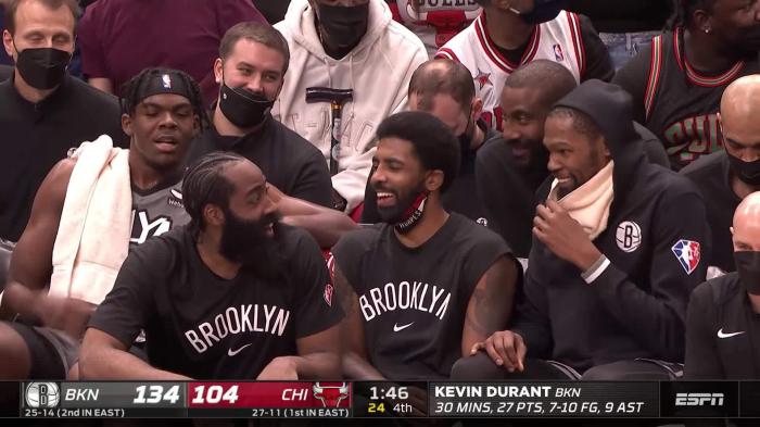 篮网三巨头大笑庆祝!杜兰特假装上场被纳什阻拦,哈登呼吁欧文打疫苗