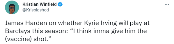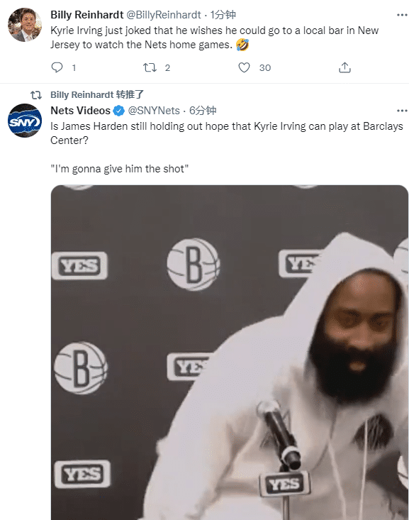 欧文还开玩笑说,他希望能去新泽西当地的酒吧看篮网的主场比赛,这番话疑似是对哈登呼吁自己打疫苗的一种回应。
