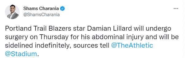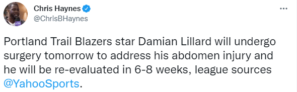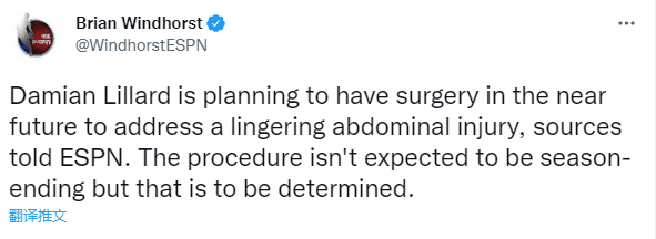 对于利拉德的手术情况,名记chris Haynes跟进报道,利拉德明天接受手术,将在6-8后接受复查;换句话说,利拉德至少伤停6-8周;根据名记Brian Windhorst报道,预计利拉德不会因此而赛季报销,但具体情况还有待术后确认。