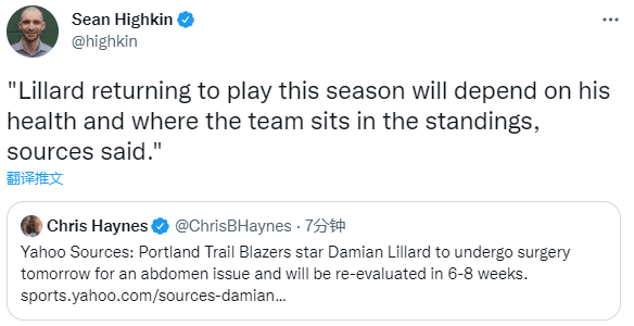 究竟利拉德本赛季是否会复出,另一记者Sean Highkin透露,利拉德本赛季能否复出,将取决于他的健康状况以及球队的排名。