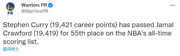 随着本场25分到手,库里常规赛总得分19425分,从而正式超越昔日超级第六人贾巴尔-克劳福德(19419分)升到历史得分榜第55位,排在库里前面的一位是特里-卡明斯(19460分),预计很快就能再次提升历史排名。