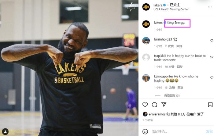 37岁詹姆斯身穿灰色运动装,戴着头巾并且反戴棒球帽,登机时满脸笑容十分开心;此前湖人官方还晒出詹姆斯训练照,双手握拳并且笑中带着一些霸气,官媒写道:能量满满的国王。