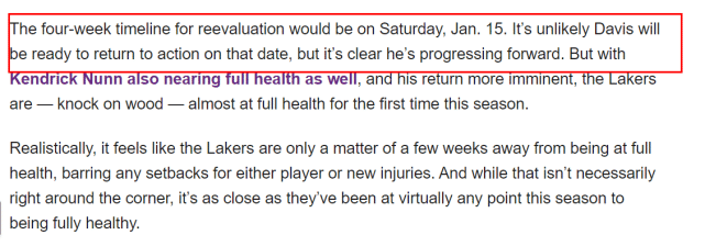 湖人记者哈里森-费根报道称,浓眉将在1月16日,也就是5天后迎来膝盖的复查。那就是他受伤满四周的日子,不过,从目前的情况来看,浓眉基本不可能在那一天复出。这意味着他要缺席不止四周的时间。《洛杉矶时报》记者丹-沃克表示,浓眉戴着那个支架主要起到预防保护的作用,他的恢复进展良好,但暂时没有复出的确切日期。