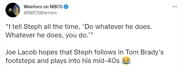 拉科布表示:汤姆-布雷迪(NFL历史级球员)现在44岁。我总是告诉库里:他(布雷迪)怎么干,你就怎么干;我真心地认为库里可以继续打出高水准的比赛,或许克莱也可以,他们可以比过去的大多数球员打得更久。