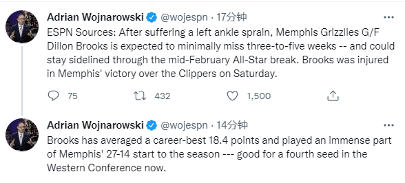 来源:JRS直播网01-10 11:46JRS直播网01月10日讯 ,灰熊遭重创,据名记沃纳罗斯基报道,灰熊球员狄龙-布鲁克斯遭遇左脚踝扭伤,预计将至少缺席三到五周,并且可能会缺席整个2月中旬的全明星假期;布鲁克斯场均得到职业生涯最高的 18.4 分,并且在灰熊本赛季 27-14 的开局中发挥了重要作用。