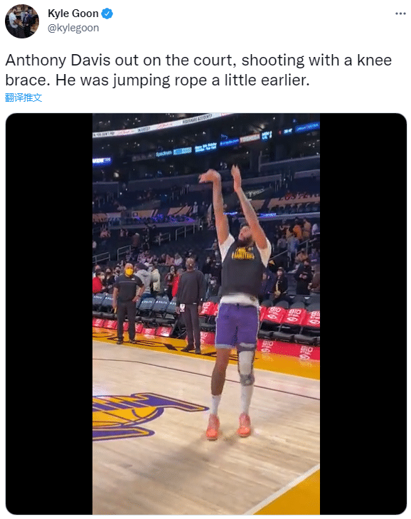 来源:JRS直播网01-10 11:45JRS直播网01月10日讯 ,湖人迎来一个好消息,浓眉参加了赛前投篮训练;湖人记者Kyle Goon晒出浓眉训练的画面,浓眉佩戴护膝进行投篮训练,投篮时脚不离地,不过这已经浓眉康复路上的一大进步,伤后不到一个月,已经开始进行投篮训练。